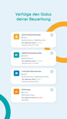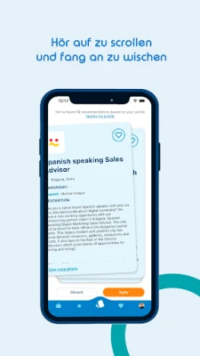 Mit der Go Places App ist die Bewerbung ein Kinderspiel. Einmal Ihr Profil und Lebenslauf hochgeladen, genügen wenige Klicks, um sich zu bewerben. Jeder Swipe nach rechts sendet Ihre Unterlagen und hilft dem System, Ihre Präferenzen noch besser zu verstehen. Verpassen Sie keine wichtigen Entwicklungen mehr: Unser Entdecken-Bereich hält Sie über trendige Arbeitgeber, beliebte Länder für Expats und attraktive Marktneuheiten auf dem Laufenden. Speichern Sie interessante Stellen für später, überdenken Sie verworfene Angebote oder teilen Sie aufregende Funde mühelos mit Freunden, um sie bei ihrer eigenen Reise zu unterstützen. Die Go Places App begleitet Sie auf jedem Schritt Ihres Weges zu einer internationalen Karriere.