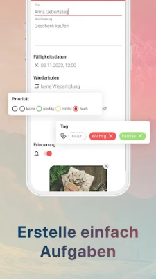 Verabschieden Sie sich von chaotischen Aufgabenlisten und begrüßen Sie mühelose Organisation mit Todo Reminder. Diese innovative App verwandelt Ihre alltäglichen Verpflichtungen in übersichtliche, handhabbare Schritte. Jede Aufgabe kann detailliert angereichert werden: Vergeben Sie Prioritäten, fügen Sie individuelle Tags hinzu, hinterlegen Sie Sprachnotizen oder befestigen Sie wichtige Dokumente und Bilder als Anhänge. Für maximale Produktivität sorgt das interaktive Widget direkt auf Ihrem Homescreen, das Ihnen ermöglicht, Aufgaben abzuhaken oder neue Einträge zu erstellen, ohne die App zu öffnen.